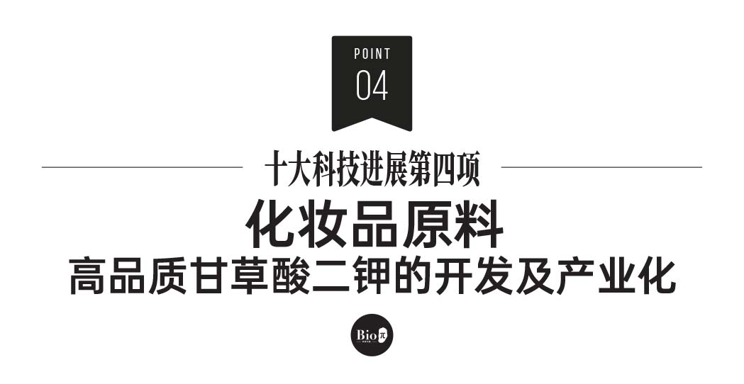 该项目由甘肃泛植制药有限公司主导研发,本项目通过离子交换体系与树脂技术革新,大幅降低乙醇、铵及重金属残留,提高甘草酸二钾的安全性。促使产品市场价格下降超50%,突破高品质甘草酸二钾依赖进口的瓶颈。与中国香妆协会牵头制定《化妆品用原料甘草酸二钾》团体标准并入选工信部百项团体标准应用示范项目,促进该原料在化妆品领域的产业化应用,带动全产业链发展,推动“中国成分”国际化与绿色制造。