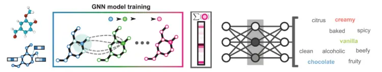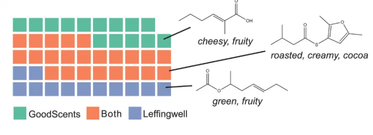 研究人员建立了一个包含约5000个已知气味分子的数据库作为训练素材。每个分子都被标记了多个气味描述词,比如“果香”、“花香”、“芝士味”或“薄荷味”。MPNN模型通过学习这些分子结构与对应气味标签之间的关系,逐渐掌握了预测新分子气味的规律。