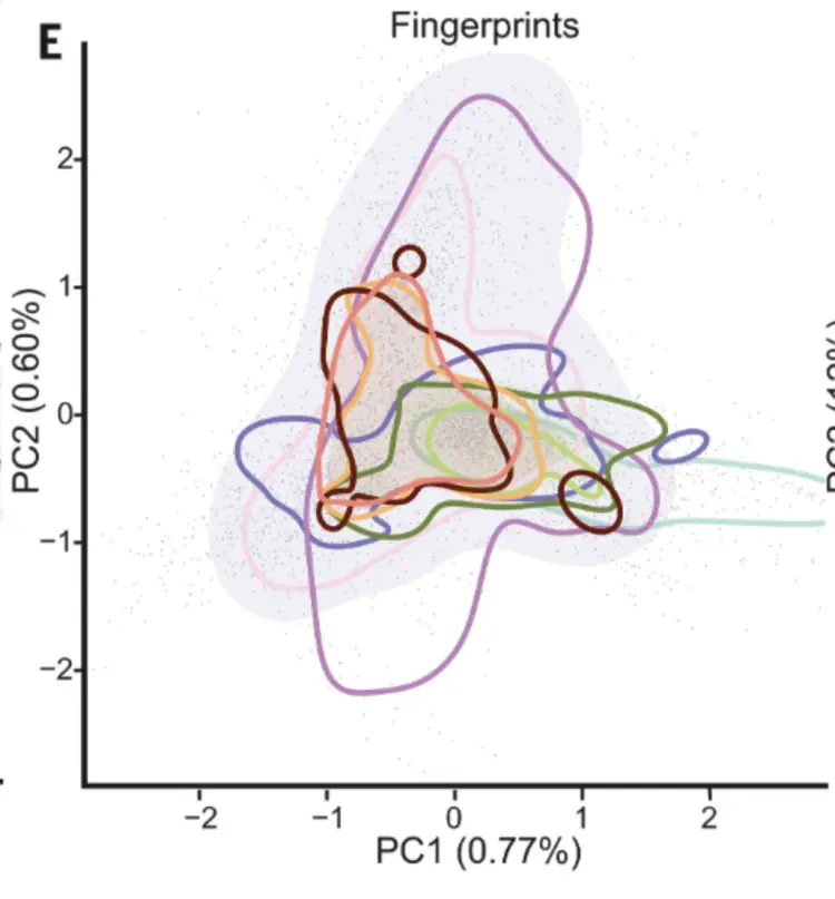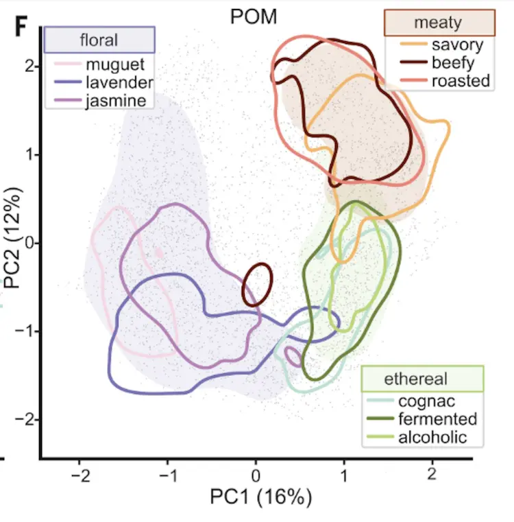 这一过程的成果是一个庞大的嗅觉高维图谱,包含了约50万种气味分子的数字表示。在这个图谱中,每种气味都有自己的“坐标位置”,气味之间的相似程度通过空间距离直观呈现。比如,花香、肉味和酒香这几个大类彼此距离较远,而百合、薰衣草和茉莉等具体花香则紧密聚集在同一区域。