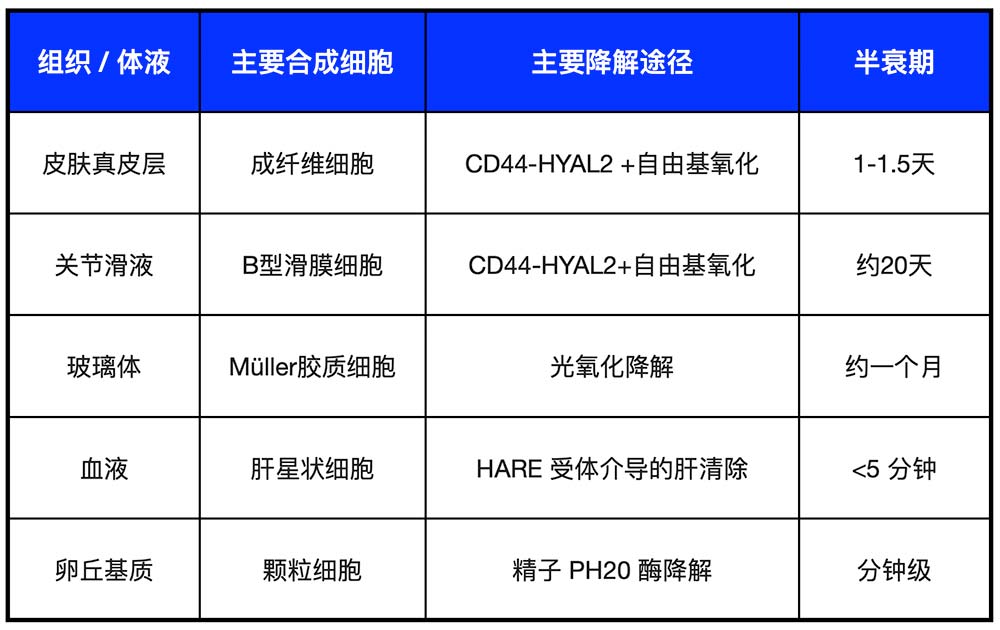不同器官因细胞类型、微环境差异,透明质酸代谢呈现显著分化: