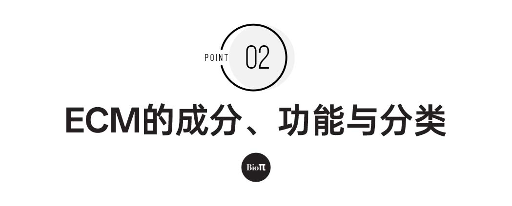 ECM主要成分有纤维类蛋白(如胶原蛋白/弹性蛋白)、糖胺聚糖与蛋白多糖(如透明质酸/硫酸软骨素)和粘连糖蛋白(如纤维粘连蛋白/层粘连蛋白)。ECM成分与细胞表面的整合素受体相互作用,使细胞能够物理地组织其3D环境,并感知和响应各种类型的机械应力。ECM作为细胞控制机制的一部分,储存多种细胞因子(如生长因子、趋化因子、炎症因子),动态调控细胞行为。