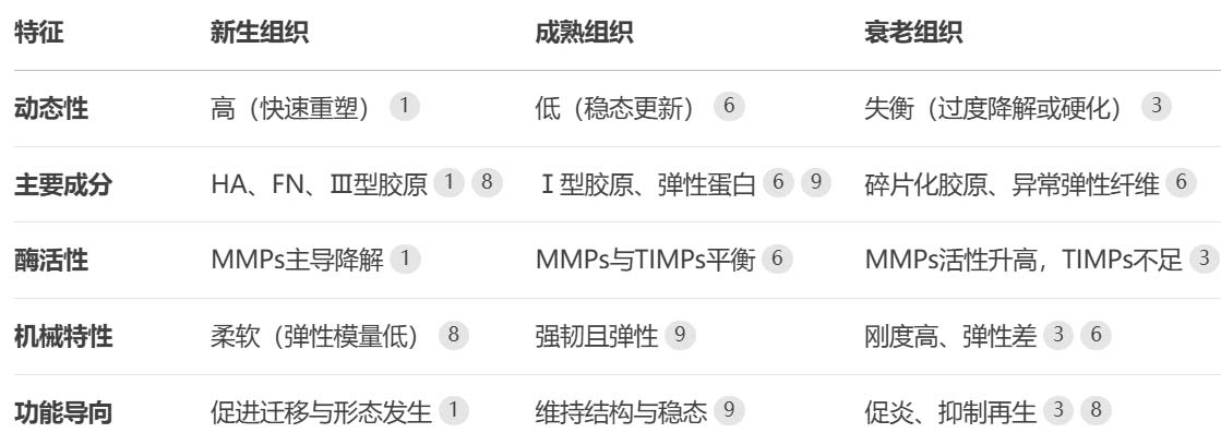 表1. 新生、成熟和衰老组织ECM关键差异对比